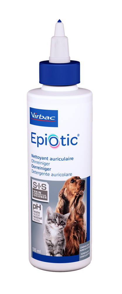 Epiotic ear cleanser is a very well-tolerated micellar solution designed for the routine cleansing of ears in dogs, cats, puppies and kittens or prior to the application of ear preparations. It removes cellular debris and excessive wax and neutralizes unpleasant smells. To improve ear canal vitality, Epiotic contains S-I-S (Skin Innovative Scienceโข technology): a combination of Glycotechnology (micro-organisms anti-adhesive eects) and (Defensin technology) stimulation of natural skin microbial defence.