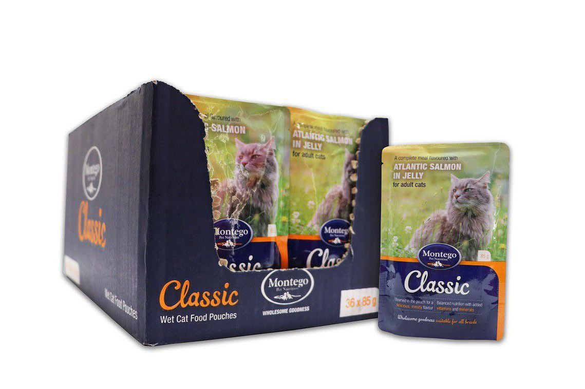 Montego’s Classic Adult Cat Atlantic Salmon in Jelly pouch is a complete meal that is flavoured with tender salmon in a rich, flavoursome aspic.