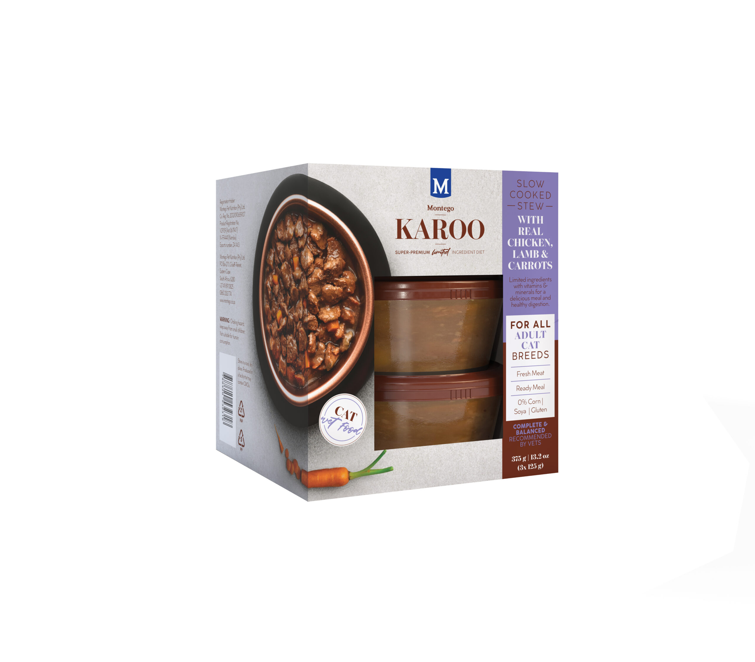 When our purring companions shower us with so much joy, love and affection, the little we can do in return is to spoil them with a mouth-watering meal. Karoo Slow Cooked Stew with Real Chicken, Lamb & Carrots is all that. While your purr-fect friend delights in her meal, you can rest assured that she will get all the vitamins, minerals, and amino acids she needs to ensure a healthy digestive tract and good muscle development. The wet diet ensures that she gets a much-needed imitation of her authentic dietary plan, which will, in return, aid her urinary tract health. Karoo Slow Cooked Stew with Real Chicken, Lamb & Carrots Wet Adult Cat Food: tender, juicy and rich in nutrition with no added soya, gluten or corn.