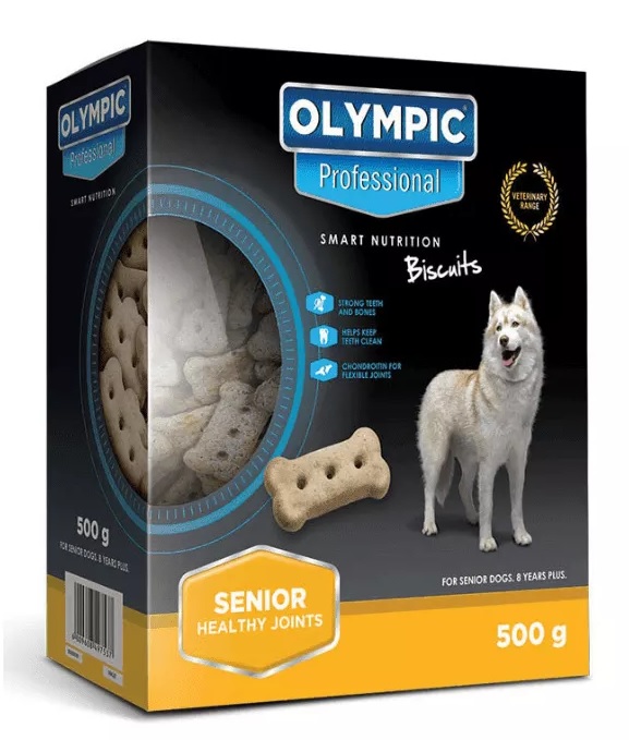 OLYMPIC® PROFESSIONAL SENIOR biscuits for healthy joints, is a complimentary food for the pet companion of an advanced age. Our biscuits make a great snack after an outdoor run, and a well-deserved reward when your pooch has been a “good dog”! Its satisfying taste and crunchy hardness also provide your dog with a gnawing exercise for healthy teeth and gums.