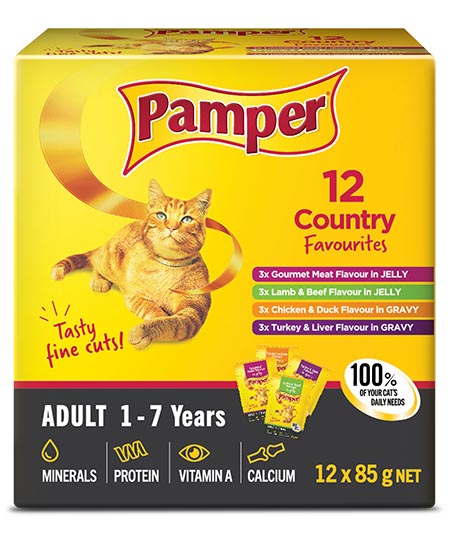 This selection of Pamper® Country Favourites is a multipack of Pampers® fine cuts in both jelly and gravy. Suitable for adult cats between 1 and 7 years of age, they have balanced minerals, protein for tissue maintenance, Vitamin A for healthy vision and calcium for strong bones and teeth to provide 100 % of your cats daily needs. Multi pack 12 x 85 g