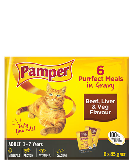 Pamper – Beef & Liver & Veg Multi-Pack Gravy Cat food – 6 x 85g