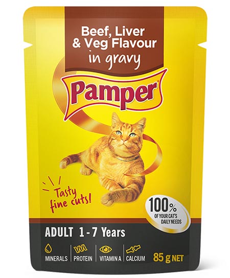 Pamper® Beef, Liver & Vegetable Flavour fine cuts in gravy is suitable for adult cats between 1-7 years.