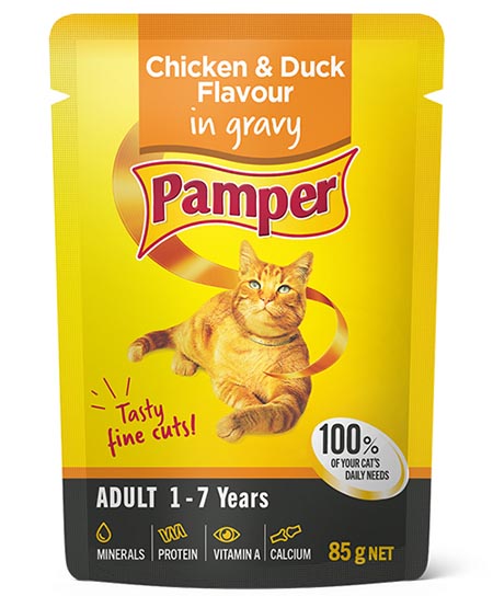 Chicken and duck flavour in gravy is a tasty wet cat food scientifically formulated for cats between 1 and 7 years of age. | These fine cuts in gravy are not only tasty but also provide your cat with important nutrients to meet their daily dietary requirements. The convenient pouch is a balanced meal on its own, but can be combined with any of the Pamper dry range foods as a delicious gravy. | Ingredients include: animal and meat derivatives, vegetable protein concentrate and cereal, minerals, flavourants, various sugars, salt, vitamins, colourants, and gelling agents. | | This product is nutritionally fortified with: | * Minerals | * Protein | * Vitamin A | * Calcium | | * Size: 85 g