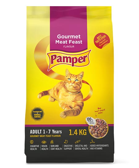 Pamper s Gourmet Meat Feast Flavour heart-shaped kibble is a gastronomical delight, fit for feline royalty. It meets 100% of your cat s daily needs and offers unique functional benefits for:_x000D_
