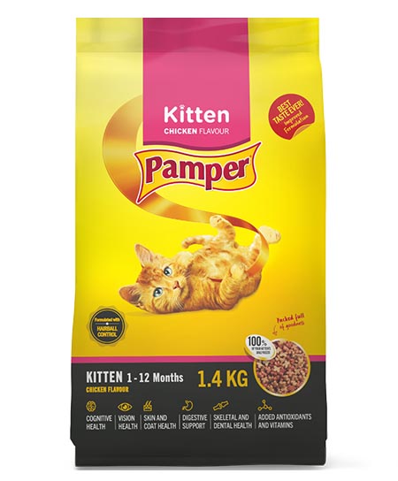 Pamper Kitten dry food comes in a delicious chicken flavour, complete with Hairball Control.
