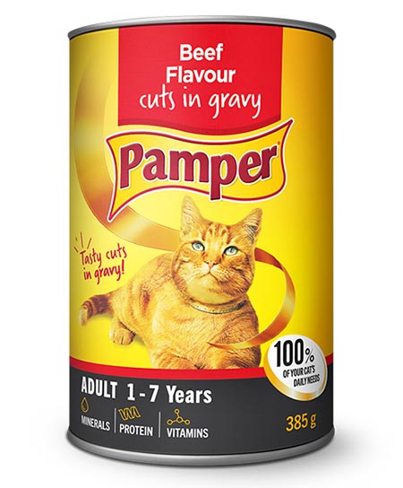 Pamper Tin – Beef Flavour – Cuts in Jelly. Tasty cuts in jelly! PAMPER’s Beef & Liver Flavour cuts in jelly meets 100% of your adult cat’s needs