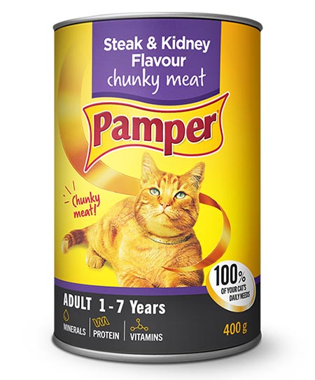 PAMPER® has a range of delicious tasty meat meals in cans, in a number of formats to satisfy your cat’s need for variety in its diet.Each can is suitable for multiple feeds (remember to refrigerate…