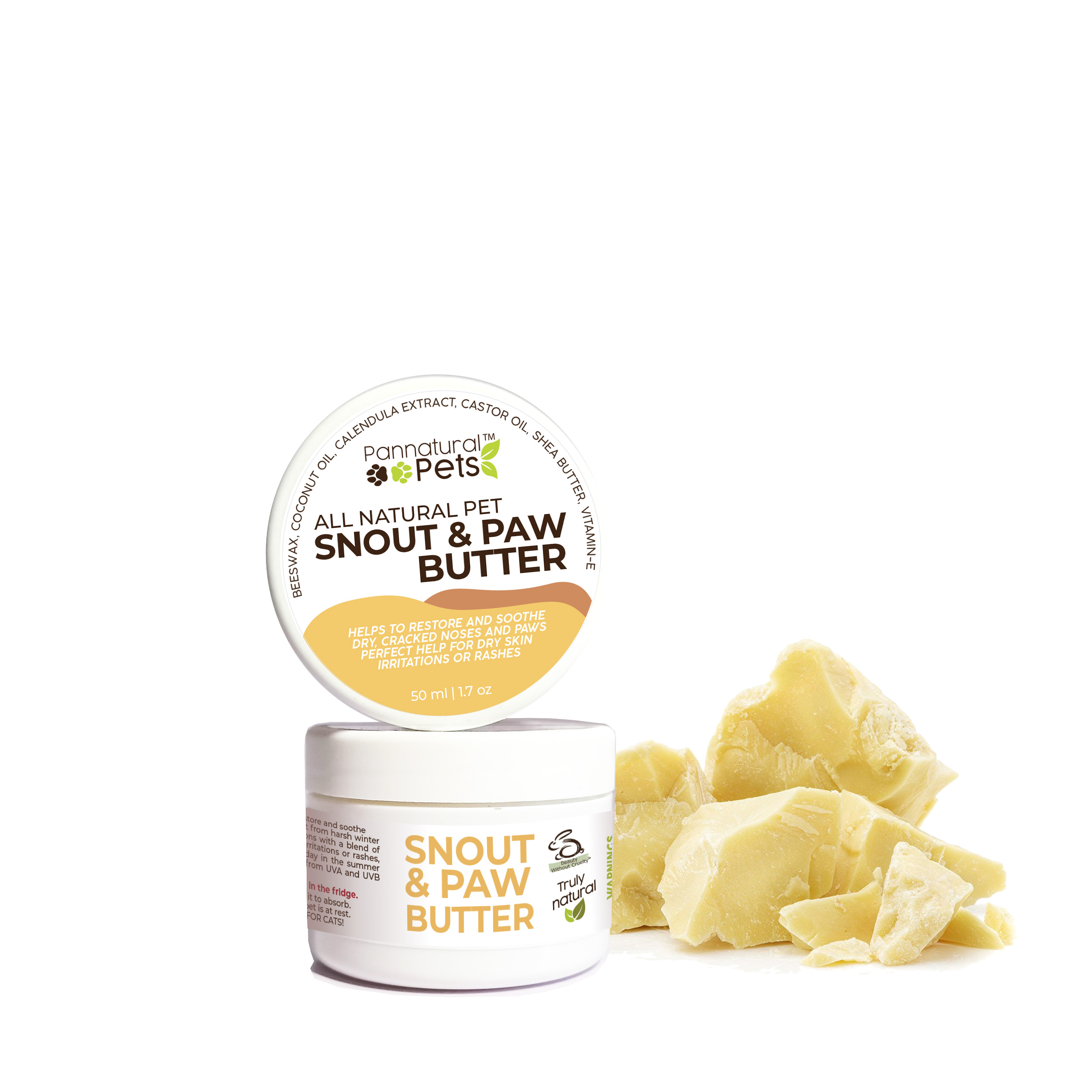 Snout and Paw Butter helps to restore and soothe dry, cracked noses and paws. It also helps to protect your pet from harsh winter and summer conditions. Moisturises and conditions with a blend of natural waxes and oils. Perfect help for dry skin irritations or rashes, cracked and crusty paws and snout. Use every day in the summer months to protect the nose and outer ear areas from UVA and UVB rays.